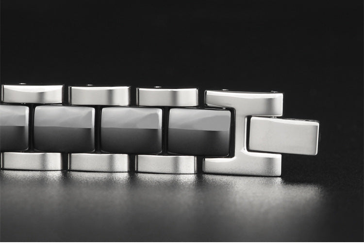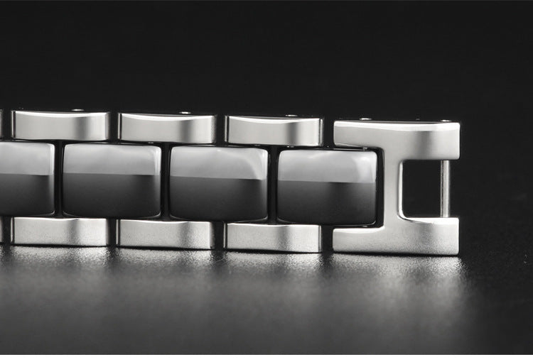 Dieses Armband kombiniert edles Keramikdesign mit robustem Edelstahl und integrierter Magnetfunktion.